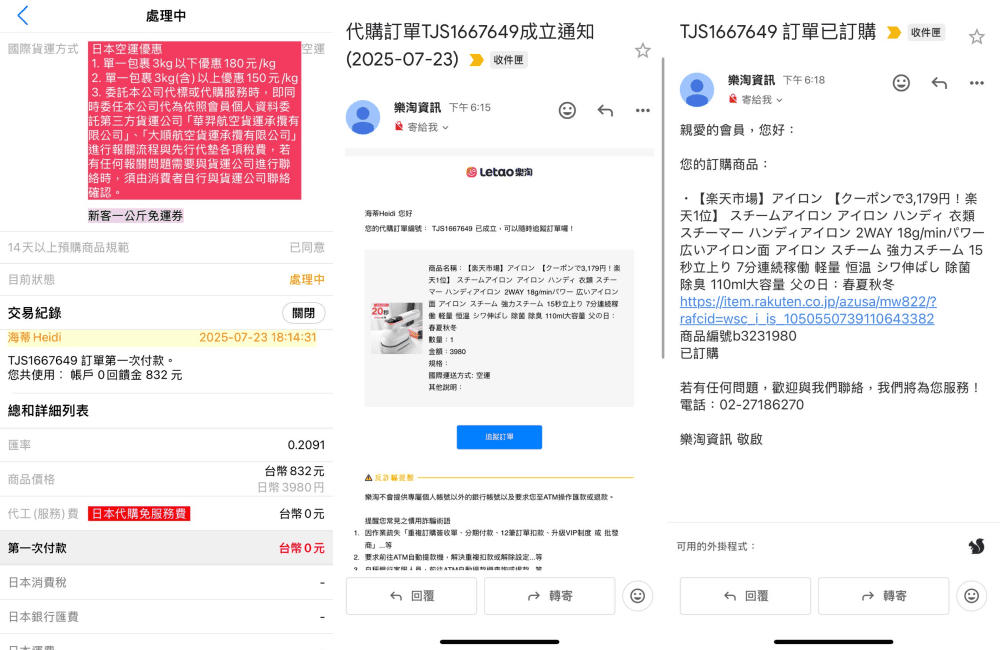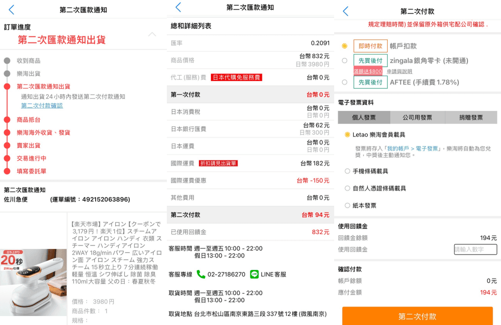 整個下單過程我都用樂淘APP,因為有任何狀態都可以直接從手機APP查看,隨時隨地接收最新狀態通知,也可以及時處理後段作業。