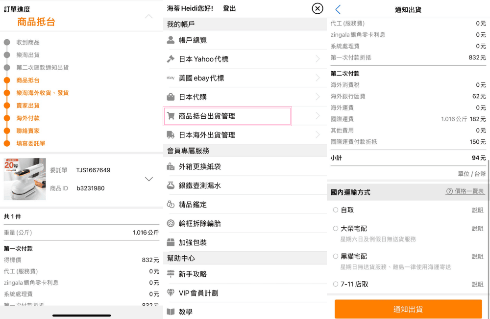 通知出貨之後,會通知你付款第二段運費,就是國內段運費,一樣可以選帳戶扣款或是先買後付。