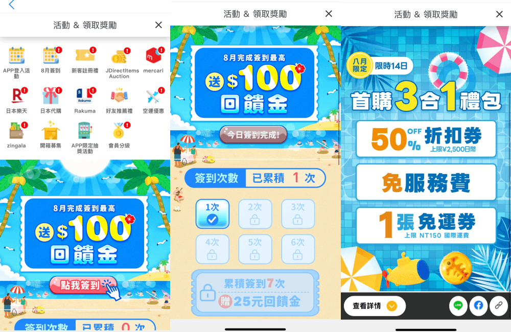 登入會員之後記得先來「活動&領取獎勵」這邊,把可以領的優惠都先領完再下單,這邊也有簽到獎勵,鼓勵大家天天來簽到,比如累積簽到7次就送25元回饋金,後面累積到第14天又可以再領25元回饋金,八月簽到最高100元回饋金,