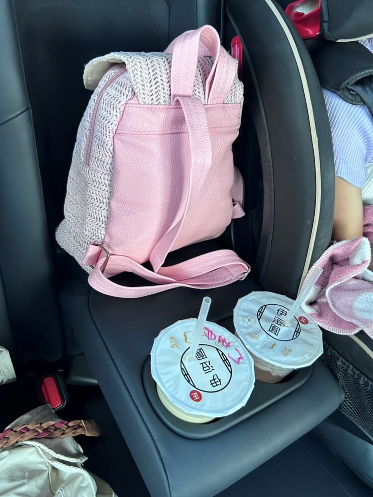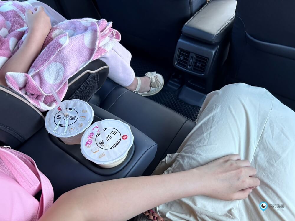 哇~ 中間這塊可以扳下來變成飲料置杯架,可以放兩杯飲料,真是太棒了!像我們常在車上吃早餐就很需要這個設計。